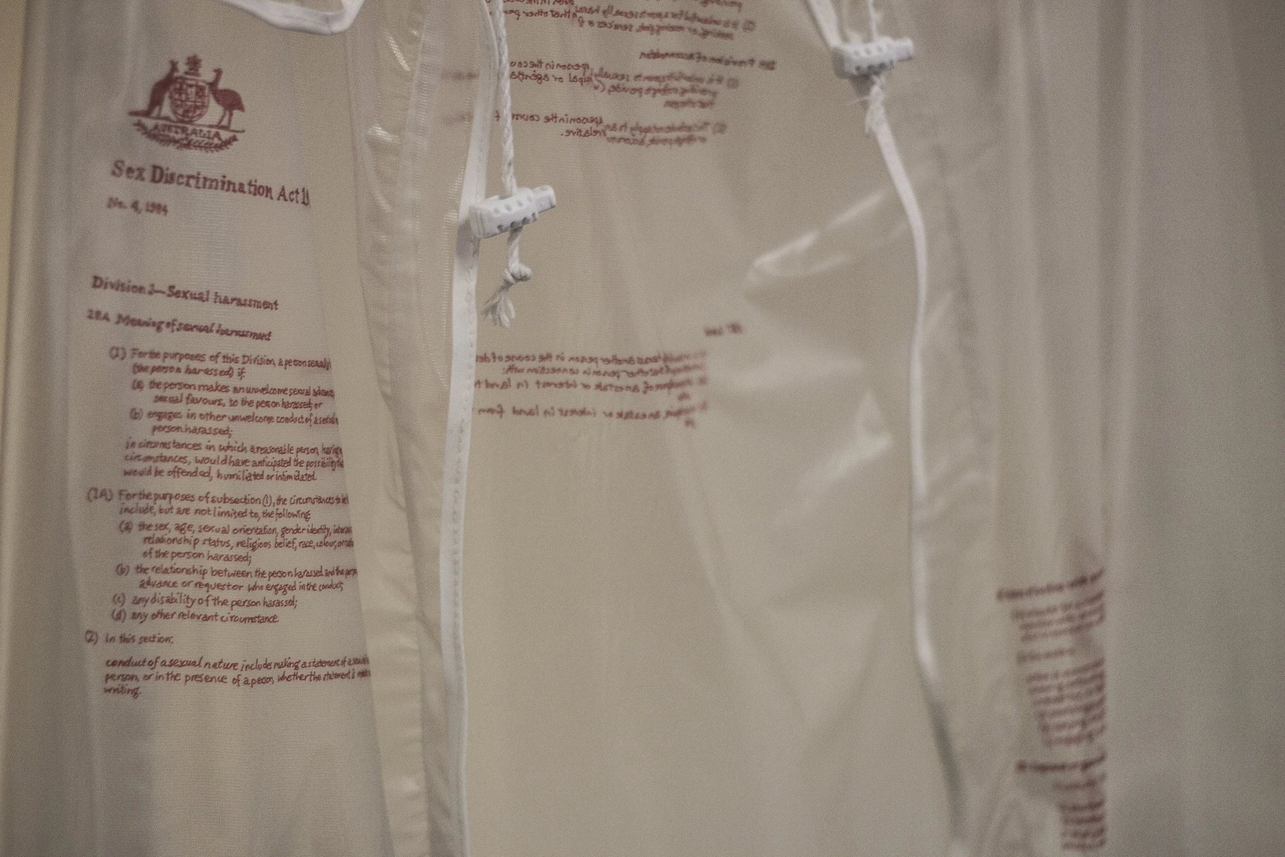 drip (2019) is a PVA raincoat inscribed with excerpts from the Sex Discrimination Act 1984 in Australia, exploring the gap between legislative promises and lived reality. Like a raincoat made of water-soluble fabric, the work suggests that legal protections for women against harassment and violence can feel fragile or ineffective. By wearing the coat, the wearer is adorned with a false sense of safety, highlighting how formal equality on paper does not always translate into real change. The work questions whether legal frameworks alone are enough and calls for deeper shifts in attitudes, behaviours, and structures to make equality meaningful.